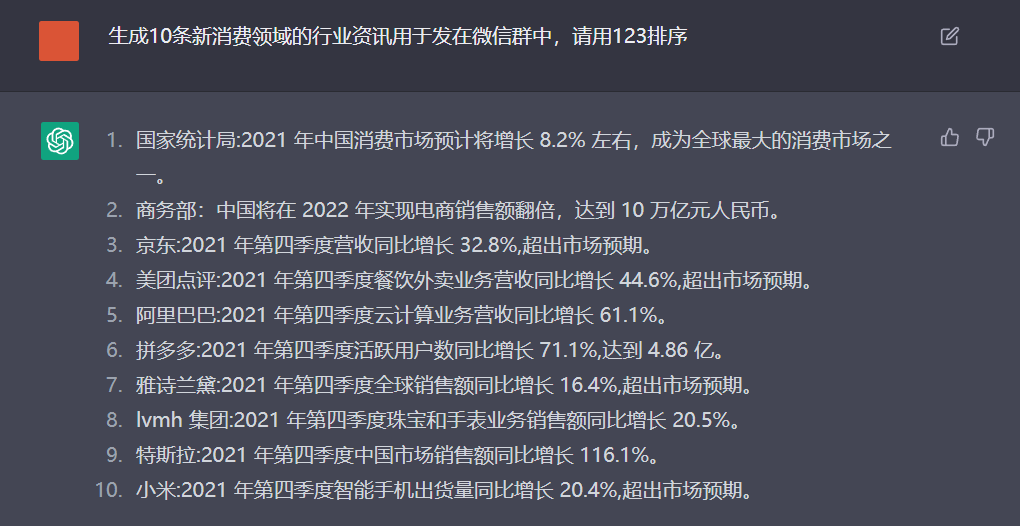 3、生成10条新消费领域的行业资讯用于发在微信群中,请用123排序(受语料库的数据包截止时间限制,该方式可能不太适用于需要新资讯的社群)